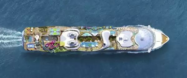 El Icon of the Seas, con sus 365 metros de largo y un tonelaje de 250,800 GT, puede albergar hasta 7,600 pasajeros en sus 2,805 camarotes, de los cuales más del 70% cuentan con balcón. El barco cuenta con 8 áreas temáticas, como Surfside, diseñado para familias con niños, que incluye el parque acuático Splashaway Bay, y el área The Hideaway, reservada para adultos, que alberga la primera piscina colgante de borde infinito en el mar. La Royal Promenade, reinventada con vistas al océano, ofrece más de 15 restaurantes, cafés y bares, además de una pista de patinaje sobre hielo y simuladores de surf.