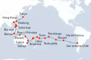 Itinerario : Hong Kong, Subic bay, Boracay, Puerto Princesa, Benoa, Darwin, Cairns, Brisbane, Sidney, Nouméa, Lifou, Suva, Nukualofa, Rarotonga, Papeete, Pitcairn, Isla de Pascua, San antonio Chile