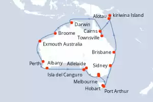 Itinerario : Sidney, Brisbane, Alotau, kiriwina Island, Cairns, Townsville, Darwin, Broome, Exmouth Australia, Perth, Albany, Adelaide, Isla del Canguro, Melbourne, Philip Island, Hobart, Port Arthur, Sidney