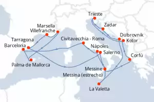 Itinerario : Barcelona, Salerno, Messine, Messina (estrecho), Corfú, Kotor, Trieste, Zadar, Dubrovnik, La Valetta, Nápoles, Civitavecchia - Roma, Tarragona, Palma de Mallorca, Villefranche, Marsella, Barcelona