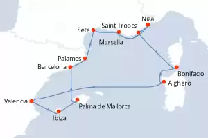 Itinerario : Niza, Saint Tropez, Bonifacio, Alghero, Valencia, Ibiza, Palma de Mallorca, Niza, Saint Tropez, Bonifacio, Alghero, Valencia, Ibiza, Palma de Mallorca