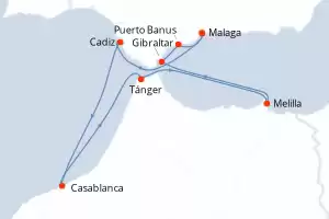 Itinerario : Malaga, Cadiz, Casablanca, Tánger, Melilla, Gibraltar, Puerto Banus, Malaga