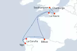 Itinerario : Southampton, Le Havre, Bilbao, Puerto de Santa Maria, Vigo, Southampton