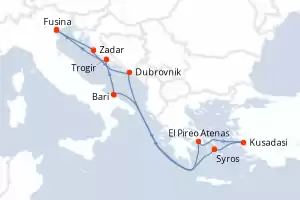 Itinerario : Fusina, Zadar, Dubrovnik, El Pireo Atenas, Kusadasi, Syros, Bari, Trogir, Fusina