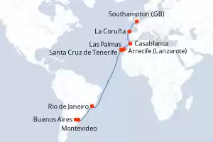 Itinerario : Buenos Aires, Montevideo, Rio de Janeiro, Las Palmas, Arrecife (Lanzarote), Santa Cruz de Tenerife, Casablanca, La Coruña, Southampton, Alesund, Trondheim, Tromso, Alta, Molde, Southampton