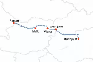 Itinerario : Budapest, Vilshofen, Budapest, Passau, Bratislava, Linz, Grein, Melk, Viena, Spitz, Krems, Melk, Viena, Dürnstein, Spitz, Bratislava, Viena, Linz, Passau, Budapest, Vilshofen, Budapest