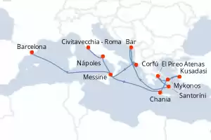 Itinerario : Civitavecchia - Roma, Nápoles, Chania, Kusadasi, Mykonos, El Pireo Atenas, Santoríni, Bar, Corfú, Messine, Barcelona
