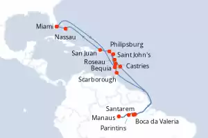 Itinerario : Miami, Bequia, Saint John's, Castries, Scarborough, Santarem, Boca da Valeria, Manaus, Parintins, , Bridgetown, Roseau, Philipsburg, San Juan, Nassau, Miami