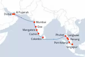 Itinerario : Singapur, Port Kelang, Penang, Langkawi, Phuket, , Colombo, Cochin, Mangalore, Goa, Mumbai, Al Fujairah, Dubai
